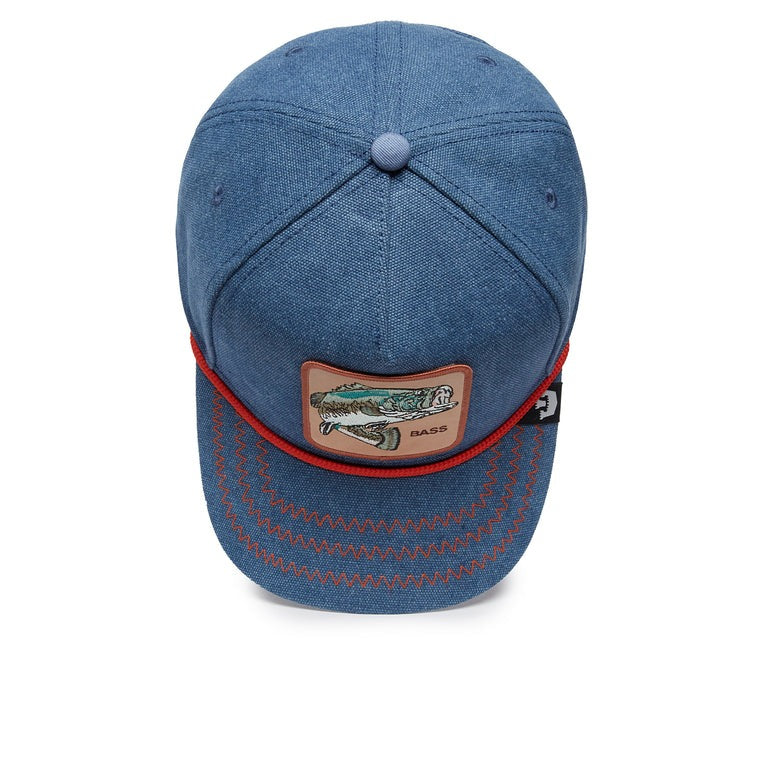 | Visual Elements | Embroidered fish patch with “BASS” text, orange zigzag stitching along the brim’s perimeter, red braided rope trim around the brim’s edge, small black tag with a white emblem |
