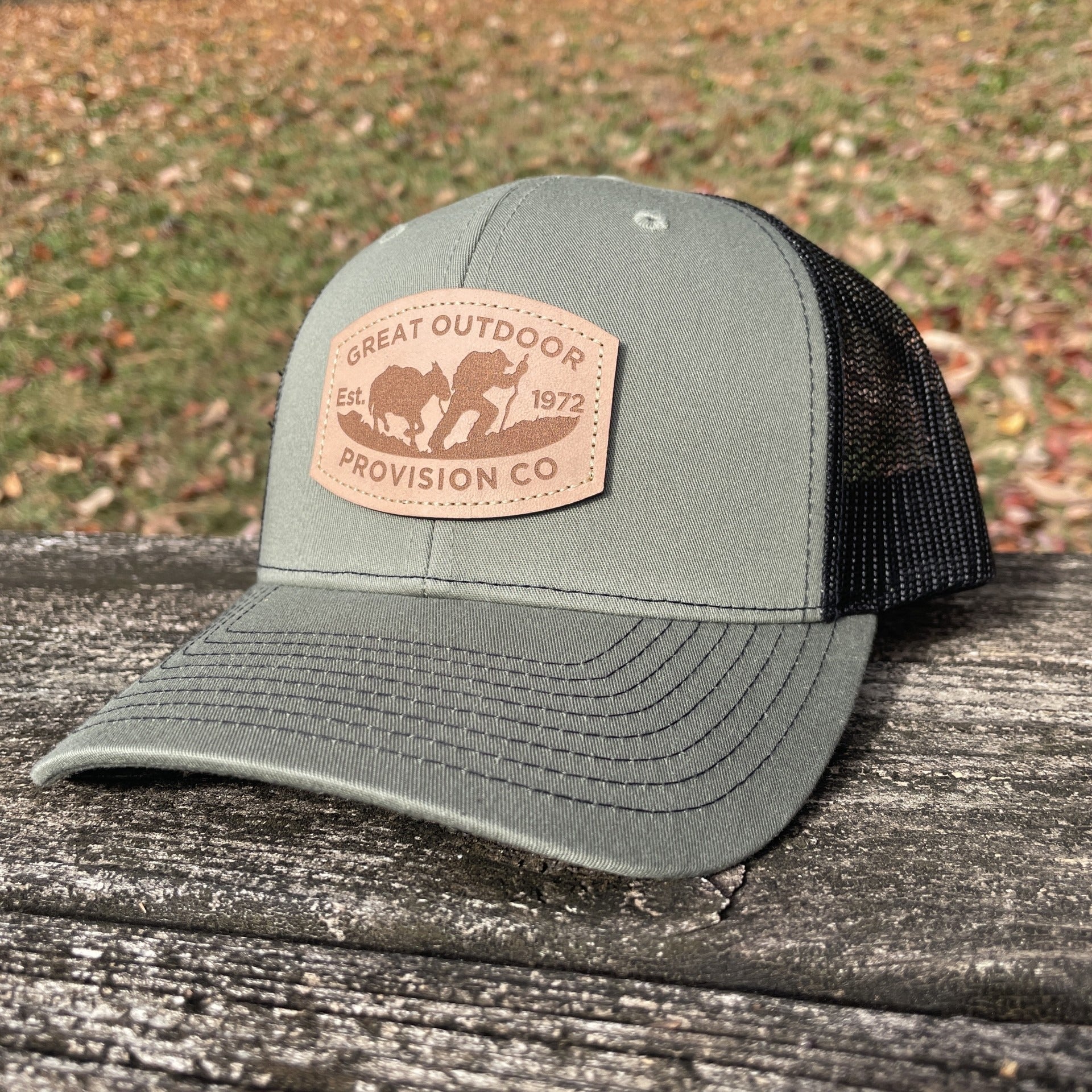 This embossed leather – patch trucker hat is a perfect blend of style and functionality. It features a sturdy front panel, likely made of cotton or a cotton blend, paired with breathable synthetic mesh on the sides and back. The natural tan leather patch with an embossed design adds a premium, rugged touch, while the overall muted gray and black color scheme gives it a versatile look.