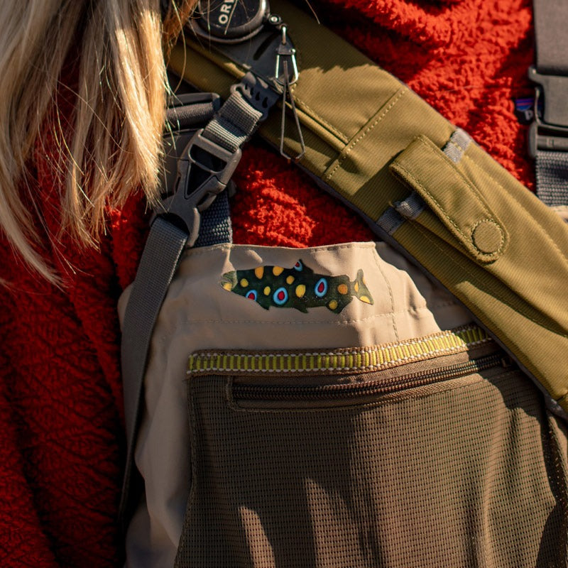 Outdoor activities such as fishing. It can be attached to vests, jackets, hats, or bags to personalize equipment and express an interest in fishing or nature.